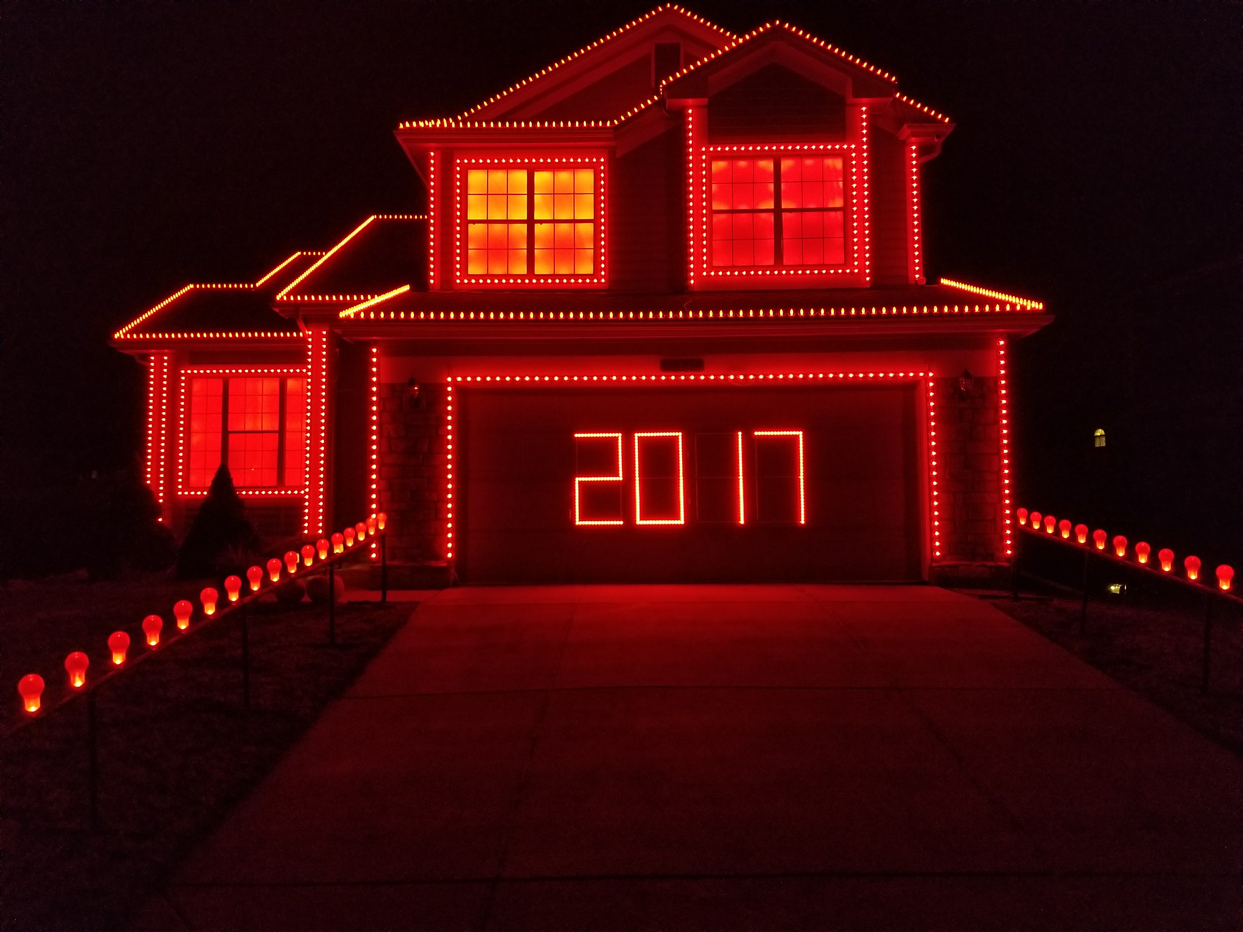 After putting together our 2016 light show, we realized that it would be very helpful to be able to display numbers with lights to show the year or to do a countdown timer to the next show. Not wanting to incur the cost of doing a full pixel screen, we figured that 4 seven-segment displays (like what is used on a calculator) could meet this need nicely. We considered several different options for where to place these displays including the shallow roof above the garage, our ridiculous amount of privacy fence to the left of the house, and a stand alone frame that would sit in the yard. However, none of these options met all of our needs as they were either too far off the main sight lines (fence) or would block the view of other elements (free-standing in the yard) or were too hard to see from the street (garage roof). So, we decided on the most complex solution: putting the displays on our garage door.