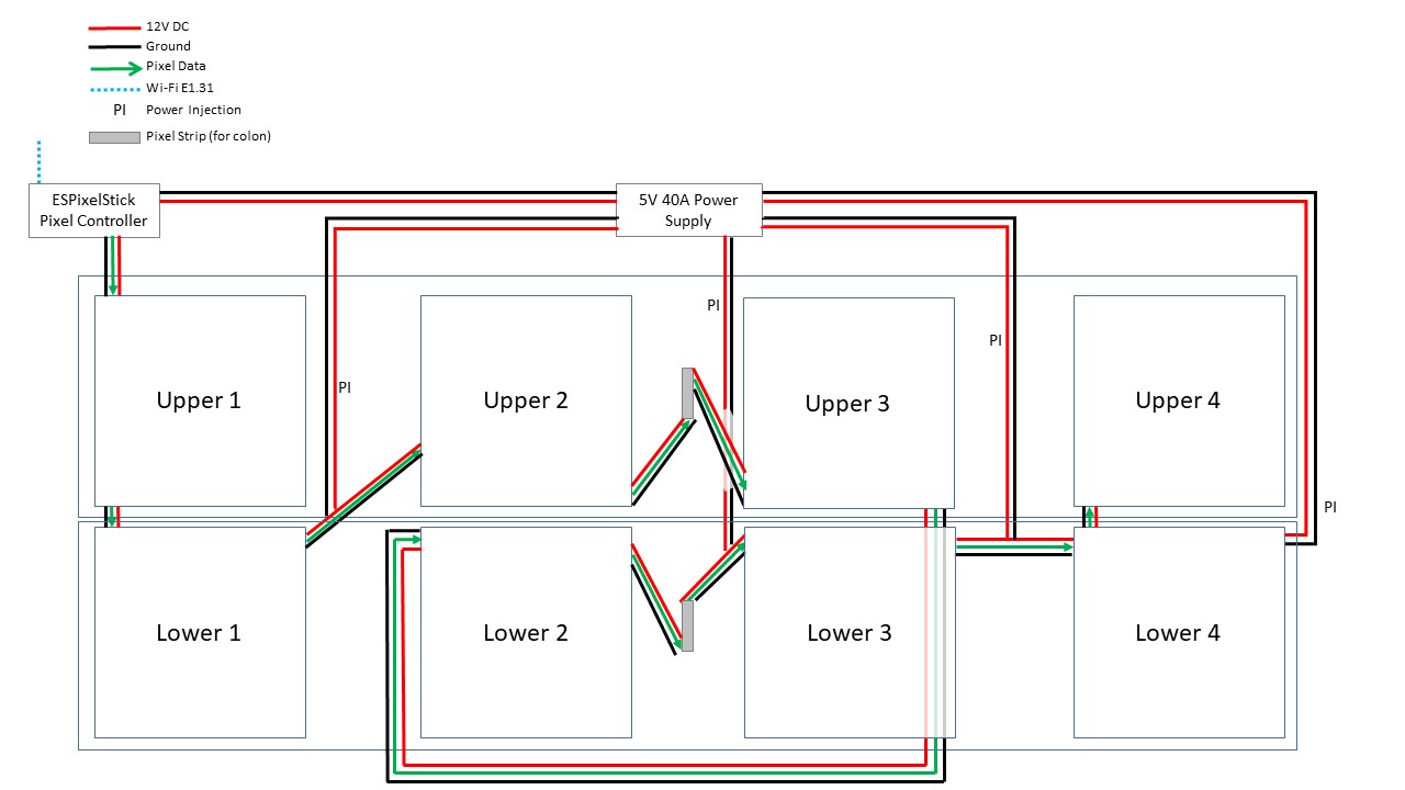 One of the reasons for having so many wires is that 5V power does not travel more than a few feet without dropping in voltage too much to be unusable. Practically, this means that we needed a lot of power injection to make sure that all of the pixels got enough power to operate well and have consistent coloring. Because of how we connected all of the panels together, power is essentially injected at the input and output of every panel and this has been more than sufficient.