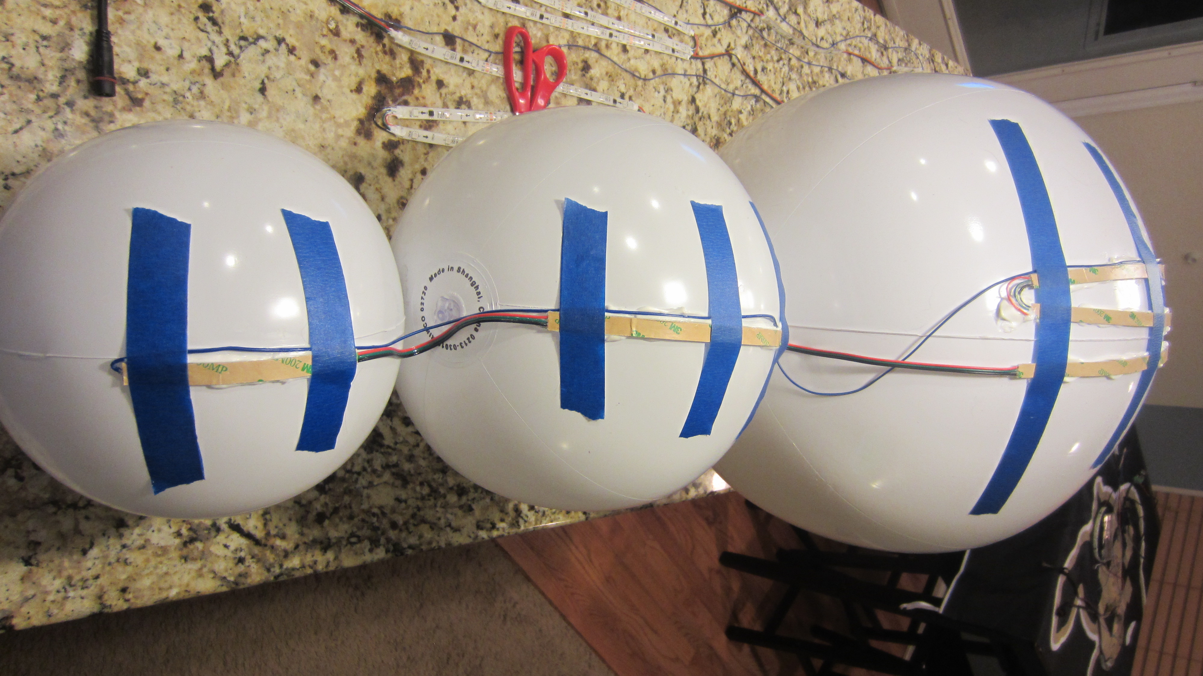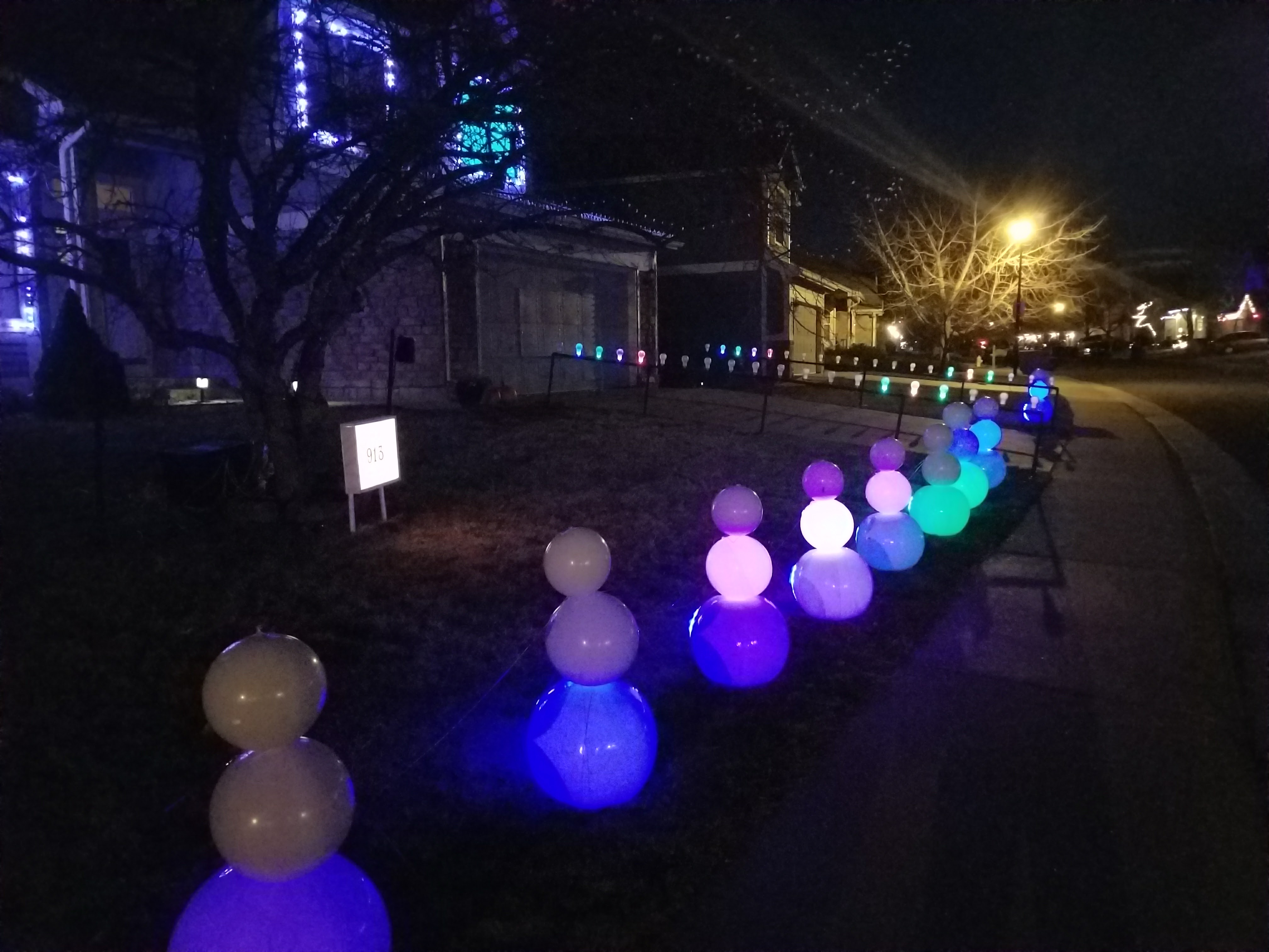 We debated for a while on the best way to light up our snowmen. Ideally, we would have placed some LEDs truly inside the beach balls, but the logistics of doing this were just too much to overcome. It is very doubtful that we could have inserted LEDs and resealed the ball to be airtight when inflated, particularly for an entire month of being outside in the snow and cold weather.