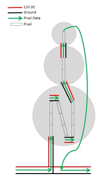 The trickiest part of wiring the snowmen is dealing with the return data line. The data path runs up the snowmen to the top pixel and then a long line has to return that signal back down to go to the next snowman. We took a bus approach for this with a main cable carrying power and data running along the ground at the front of our yard and each snowman plugging into that cable with a 4 pin connector. 3 pins are for the standard 12V power, ground, and data line to the snowman, and the 4th pin connects the return data line back to the bus for delivery to the next snowman.