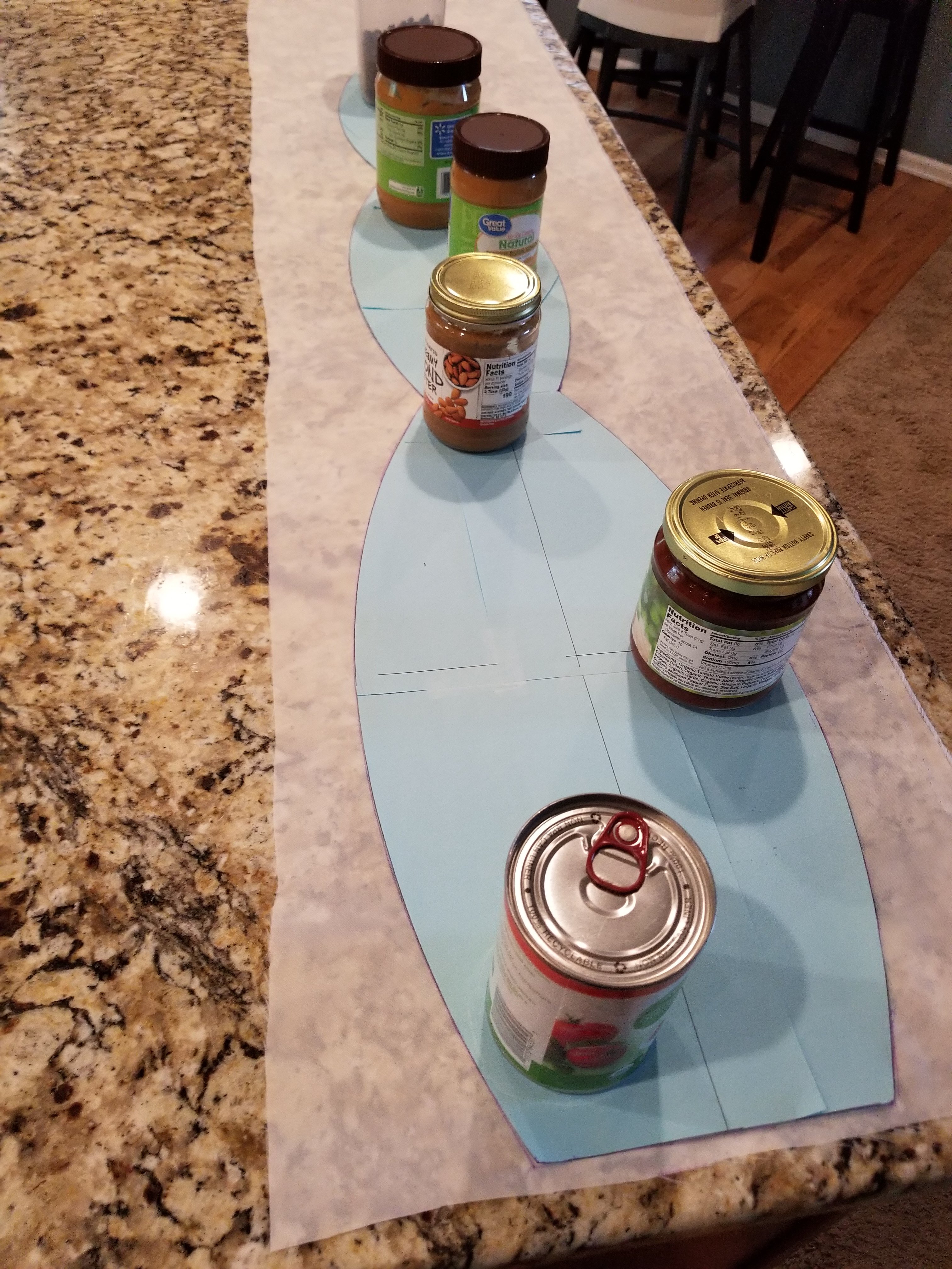 Ultimately, we cut 68 of the inner panels and 24 of the outer panels while standing at the kitchen island for many hours over several nights. It is a tedious process to trace the template onto the fabric using a disappearing fabric marker, cut the panel out, and then apply the fray check. We would typically trace the template about 4 times, then cut each of those panels out. In a good night, we would do that 3 times, yielding 12 panels, and then apply the fray check to each, hanging the panels over baby gates or chair backs to dry.