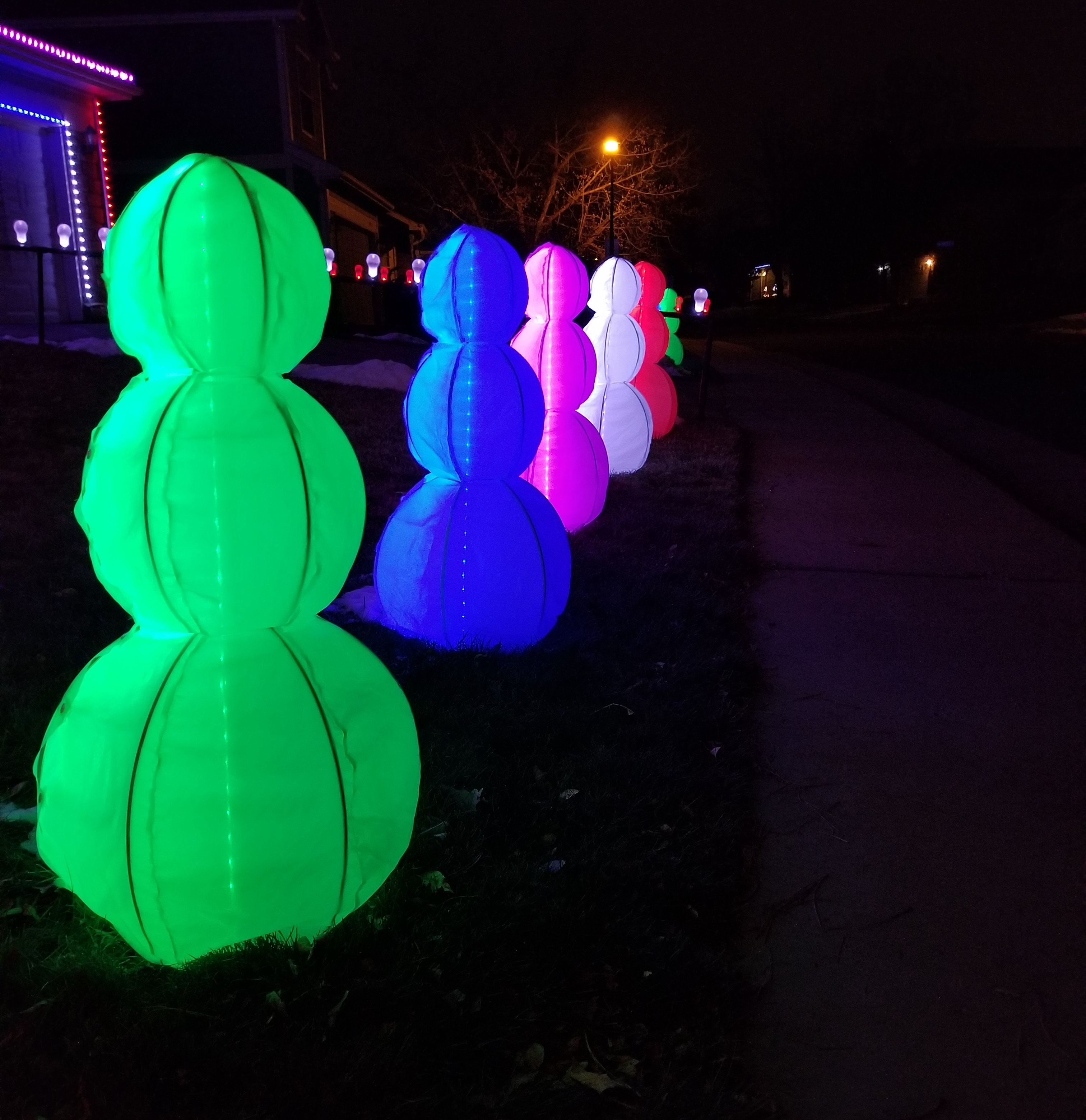 The 3 snowmen to the right of the driveway are powered by a different 12V 30A power supply that lives in the garage. Similarly, this supply powers the light bulb rail on that side of the driveway. Due to fewer pixels on this side, we found that no power injection was required.