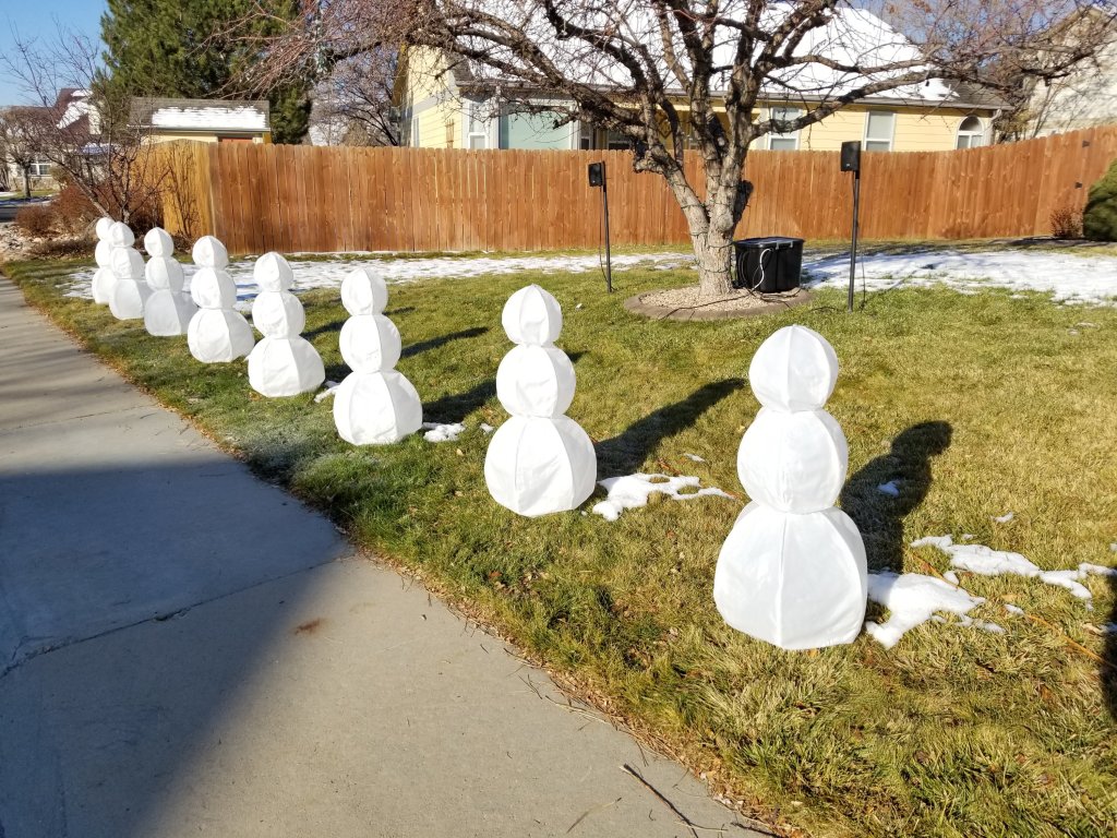 This is our second generation snowman army. The first generation fought a brave fight for 2 years but ultimately were not up for the task. For details on those original snowmen, check out LED Snowmen but we wouldn’t recommend following that design.