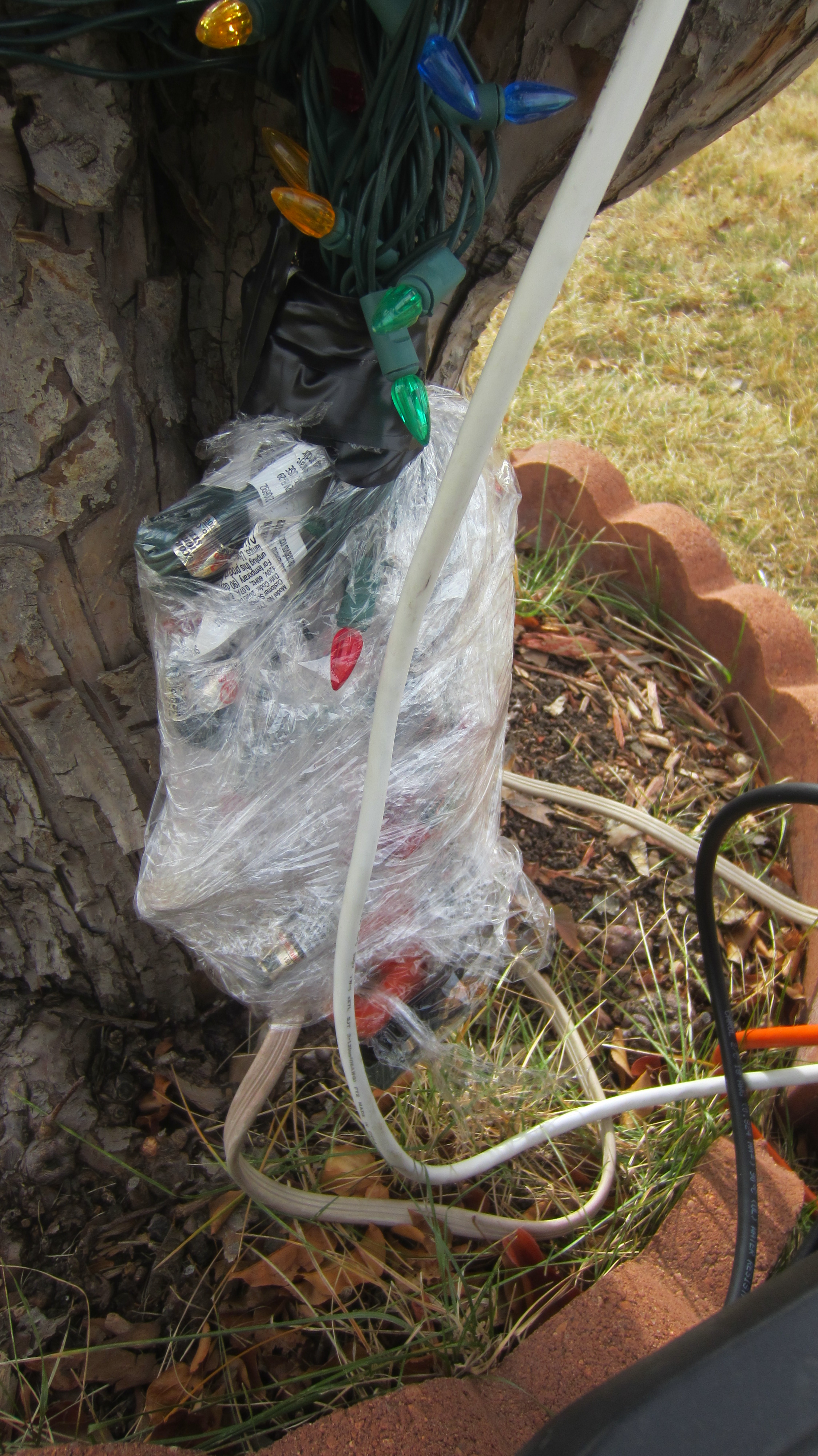 The trunk and various branches of the large tree are wrapped in 11 strands of multicolored LED lights (Martha Stewart brand, 16 feet and 50 bulbs per strand) that we also purchased on after-Christmas clearance. All of the plugs for these colored lights meet at the bottom of the tree and we use a stack of three-plug adapters and a metric ton of electrical tape to join it all together in a waterproof way and plug into the appropriate relay in the bomb box. Philip has also gotten creative at times and replaced electrical tape with saran wrap, which seems to work just as well and is less tedious than taping each connection individually.