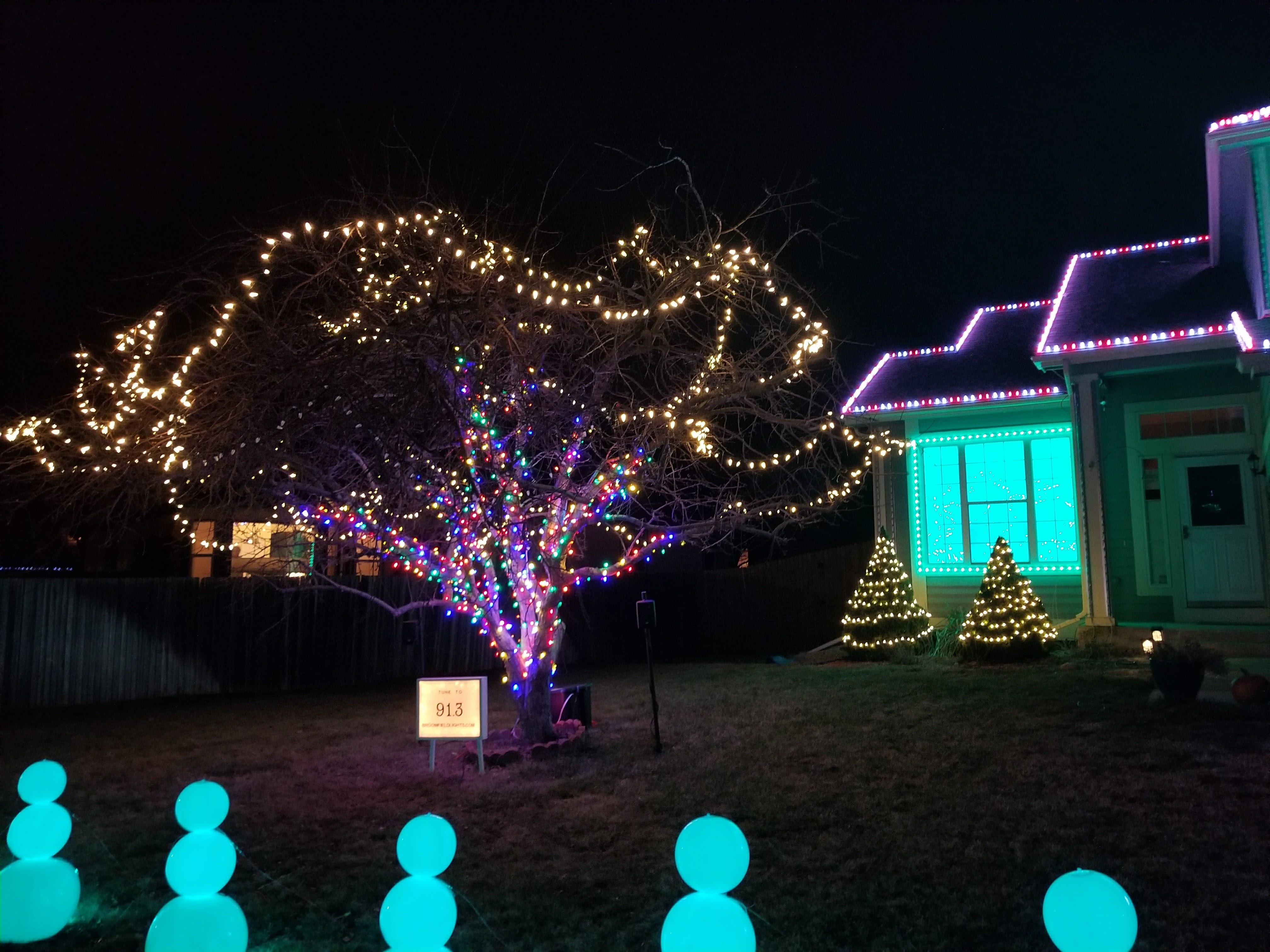 The only “traditional” Christmas lights in our display are used to wrap the two dwarf pine trees at the base of the living room window and to wrap the trunk and canopy of the large tree in the center of the front yard. There is also a single strand of traditional lights inside our Info Sign. All of these traditional lights are controlled by the relays in the bomb box.